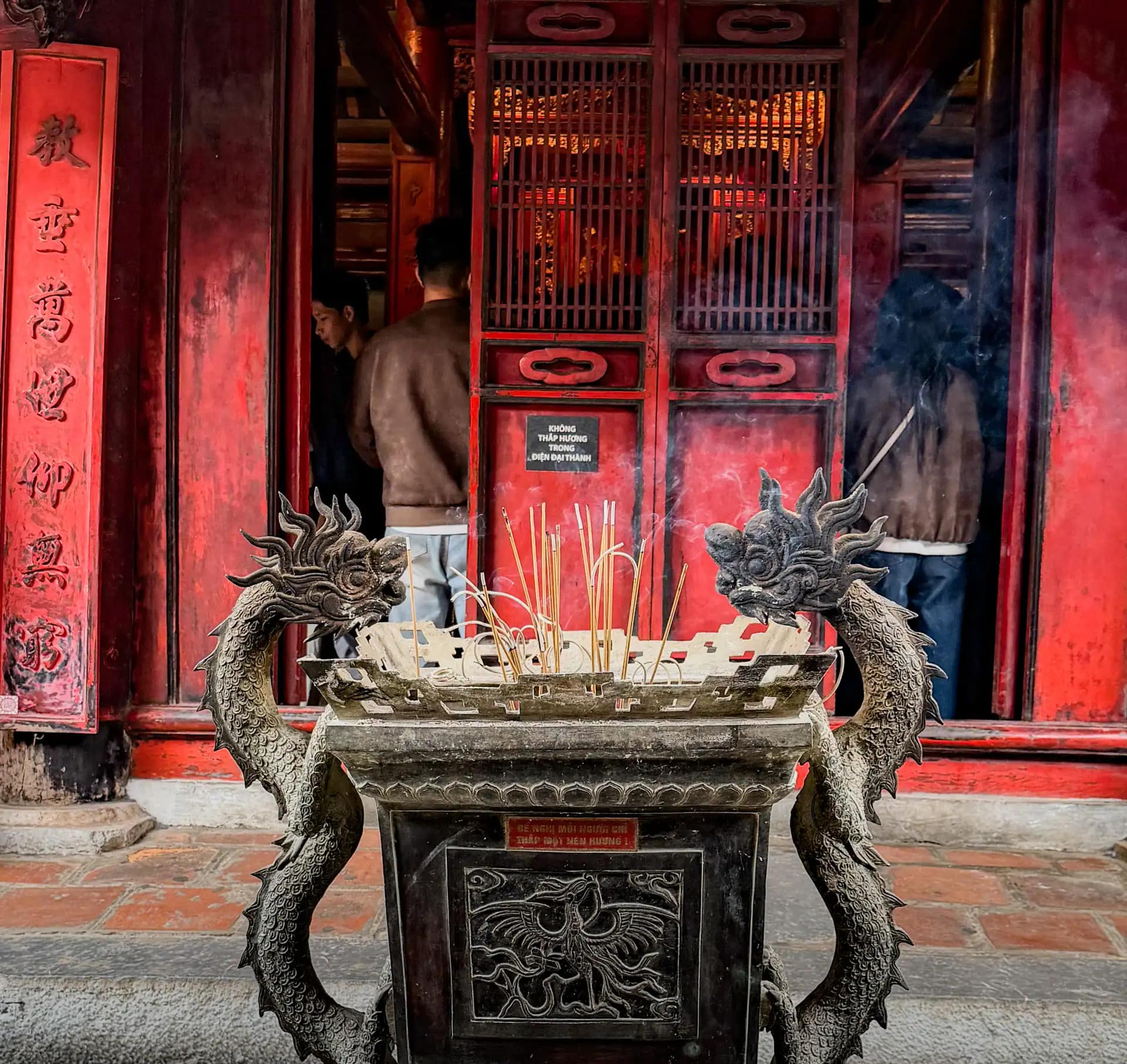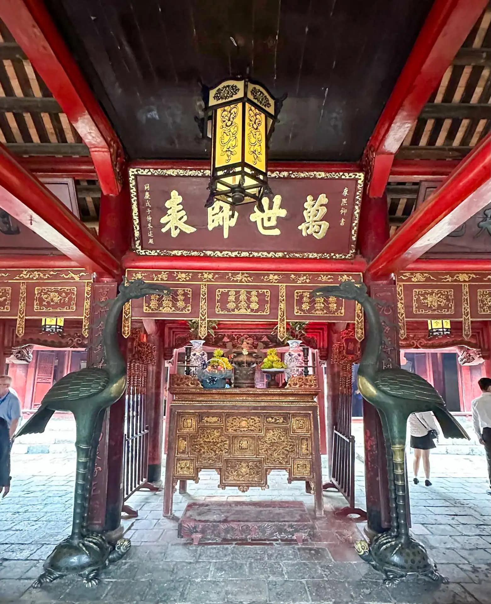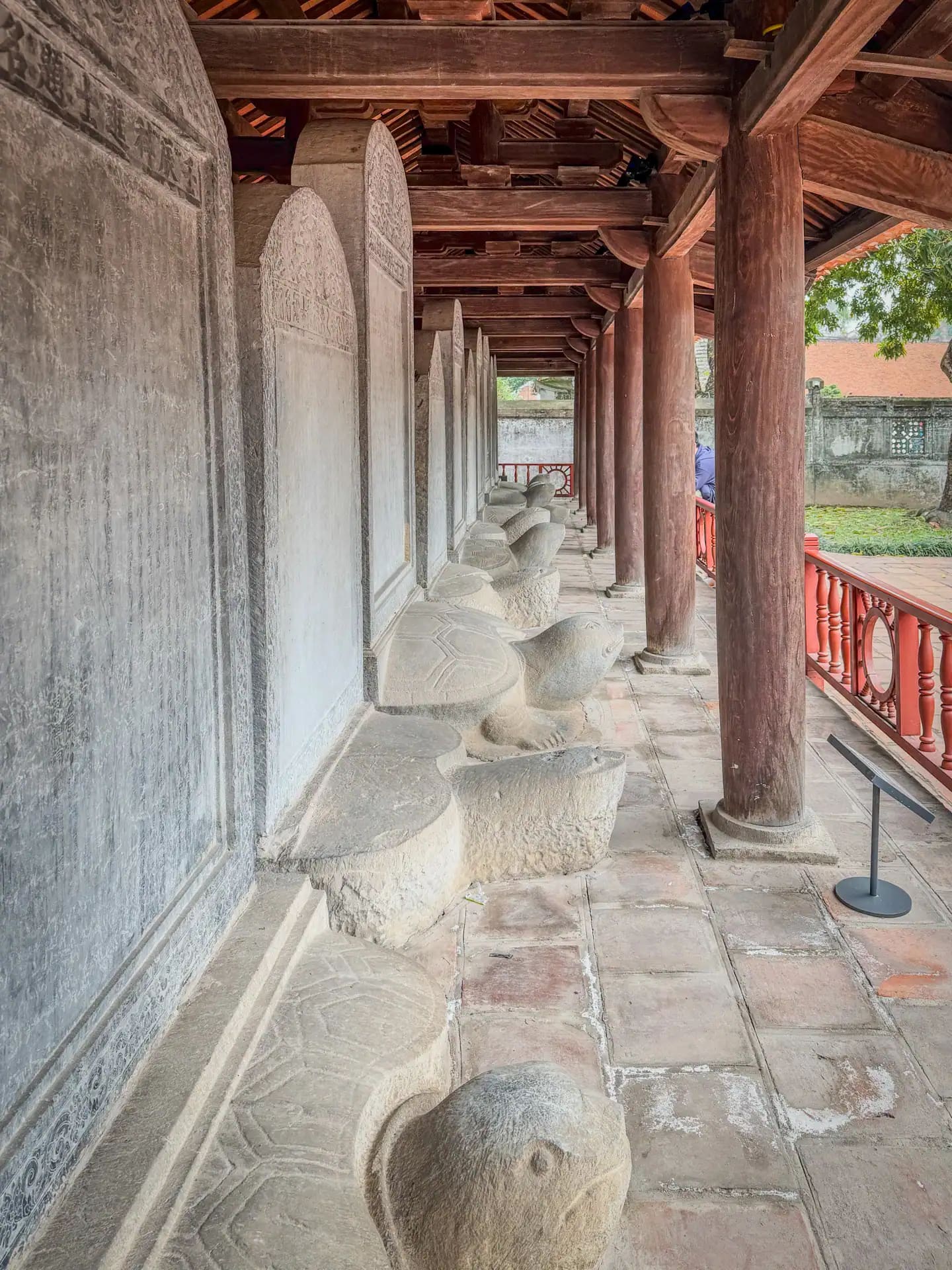 The marble monument with the turtle has a list of names of the mandarins who trained here. If somebody from a village qualified as a mandarin then the whole village was let off their taxes, so it was a very prestigious event! There was a very strong Chinese influence in the customs and the architecture here at that time. One example of this were the Chinese roof tiles sculpted like shells. The lions on the entrances to temples keep the bad spirits out, so you will often see lion statues as you enter a temple.