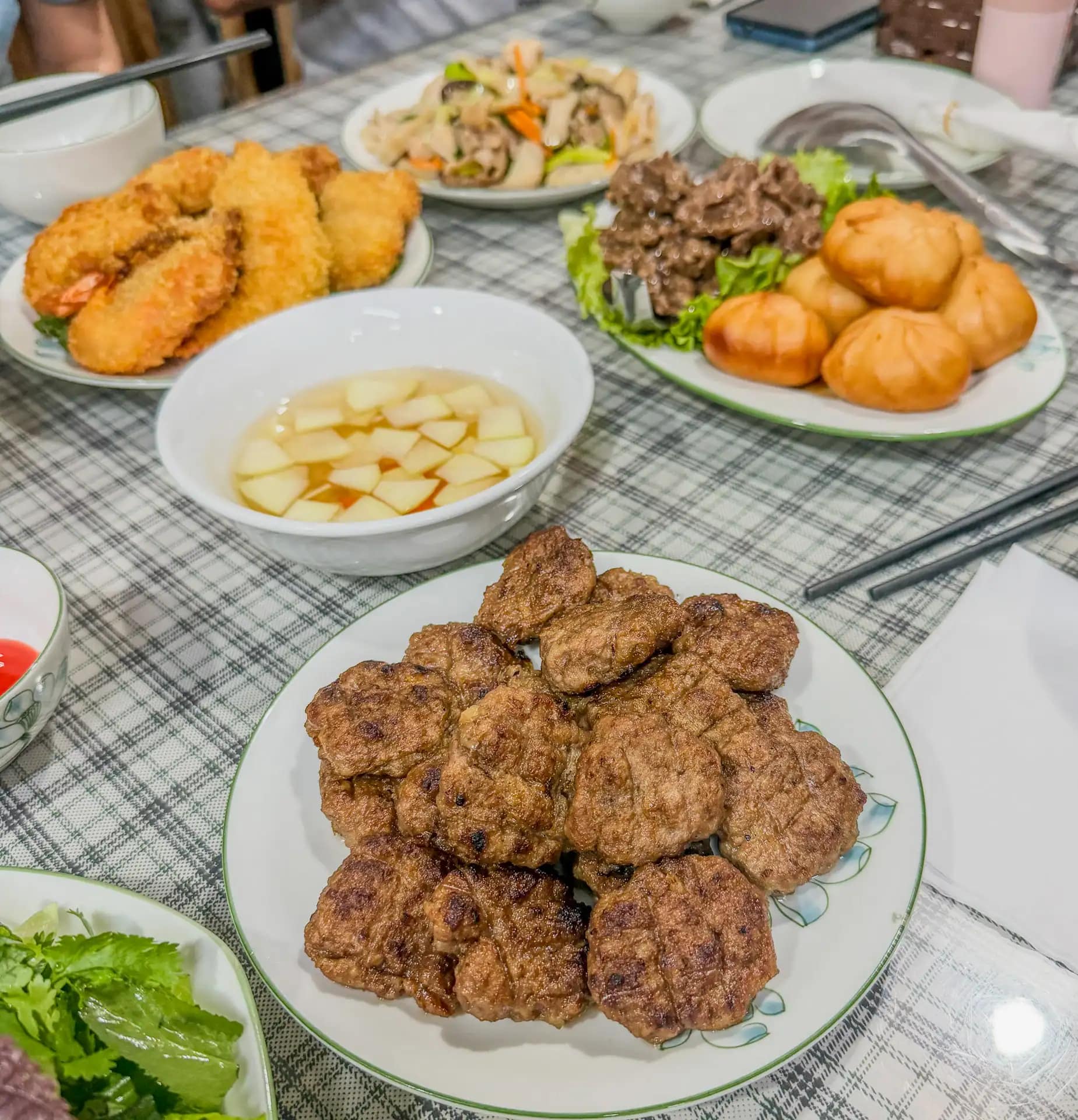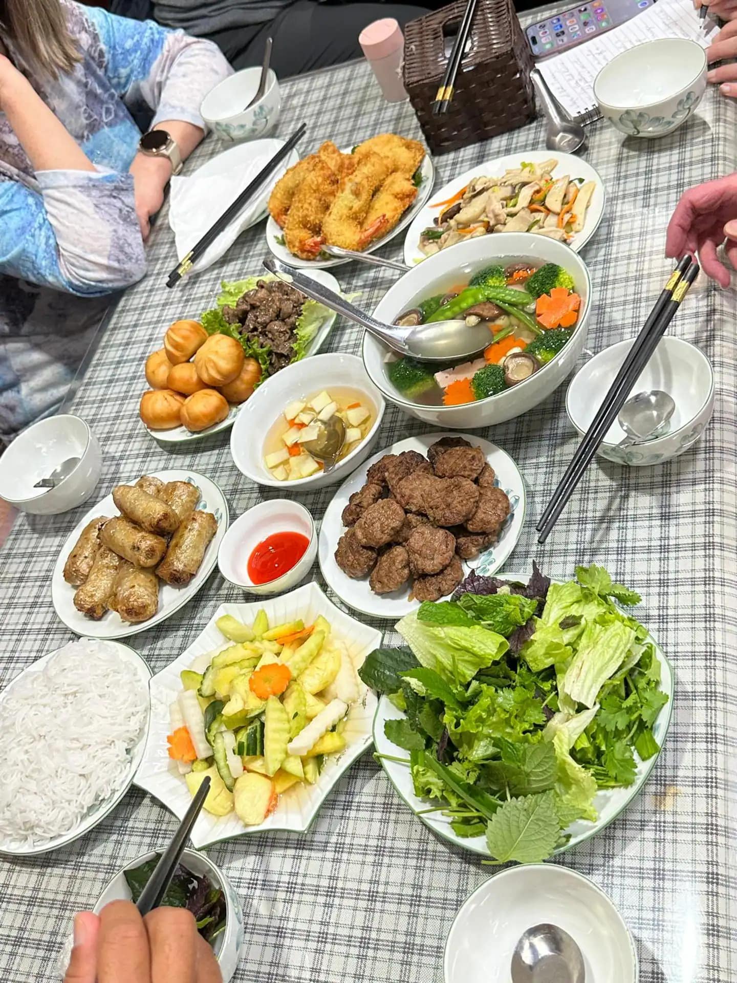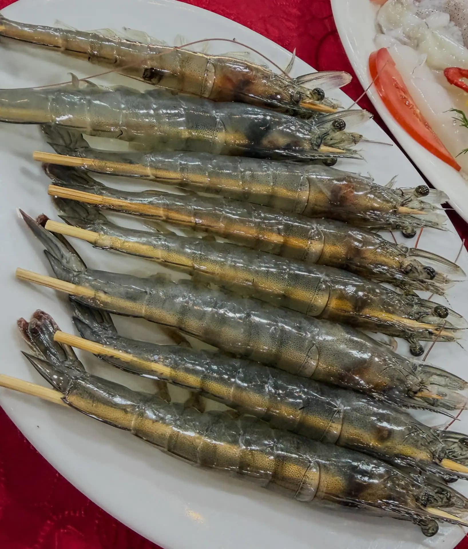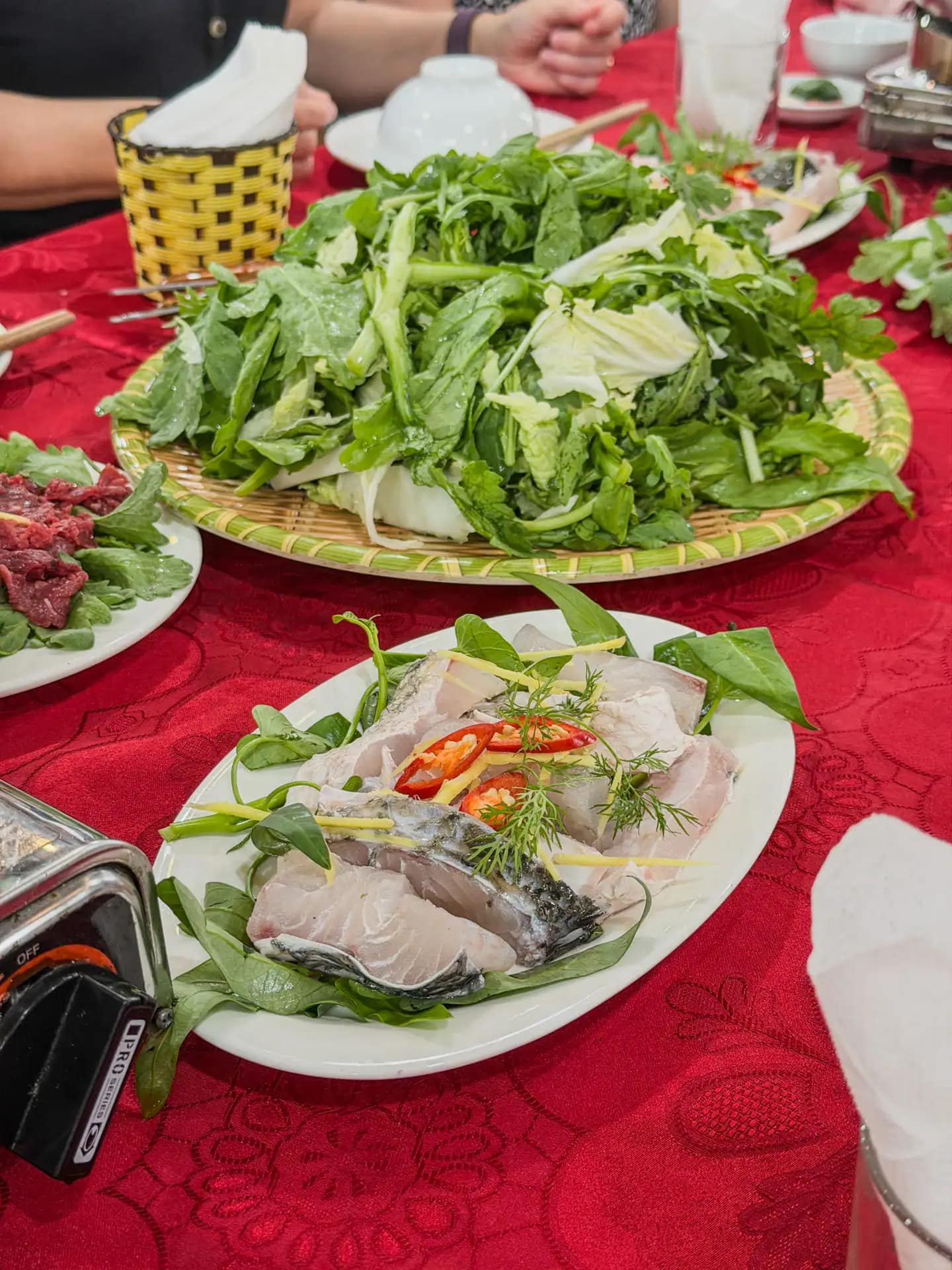 Lotus seeds, broccoli, cauliflower, mushroom and steamed pork. Battered giant prawns. Noodles, Vegetable platter with giant radish, pineapple, courgette and carved carrots, Meat patties,.Chicken and vegetables in broth.