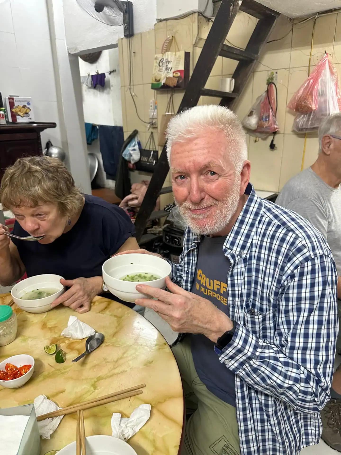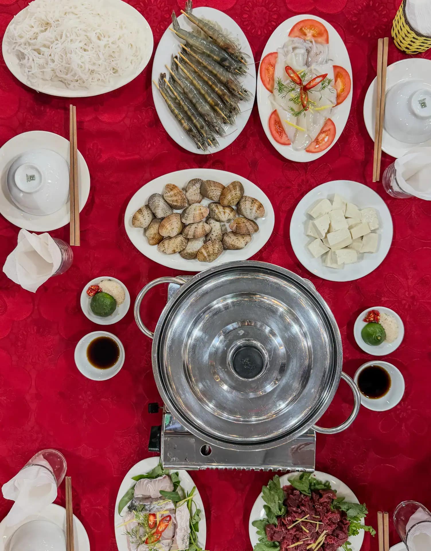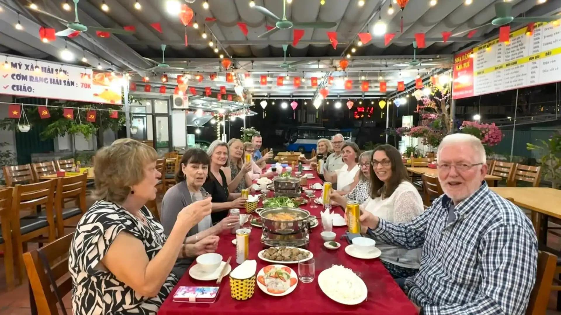 We had a fantastic meal at the restaurant. It was a seafood hot pot – a typical meal for family celebrations. The broth had been cooking for some time with vegetables in it and there were a range of ingredients which were cooked on the table as we waited. We started with squid and King prawns on skewers. This was followed by herbs, tofu, clams, seabass and finally sliced beef, all of which were flavoured with fresh lime, salt and chilli. It was rounded off with noodles and broth. We then had watermelon for dessert. We headed back to the hotel. Thin acted as our cashpoint so we were able to sit in the bar and have a couple of beers with the others until just before midnight. All in all a great first day of the tour.