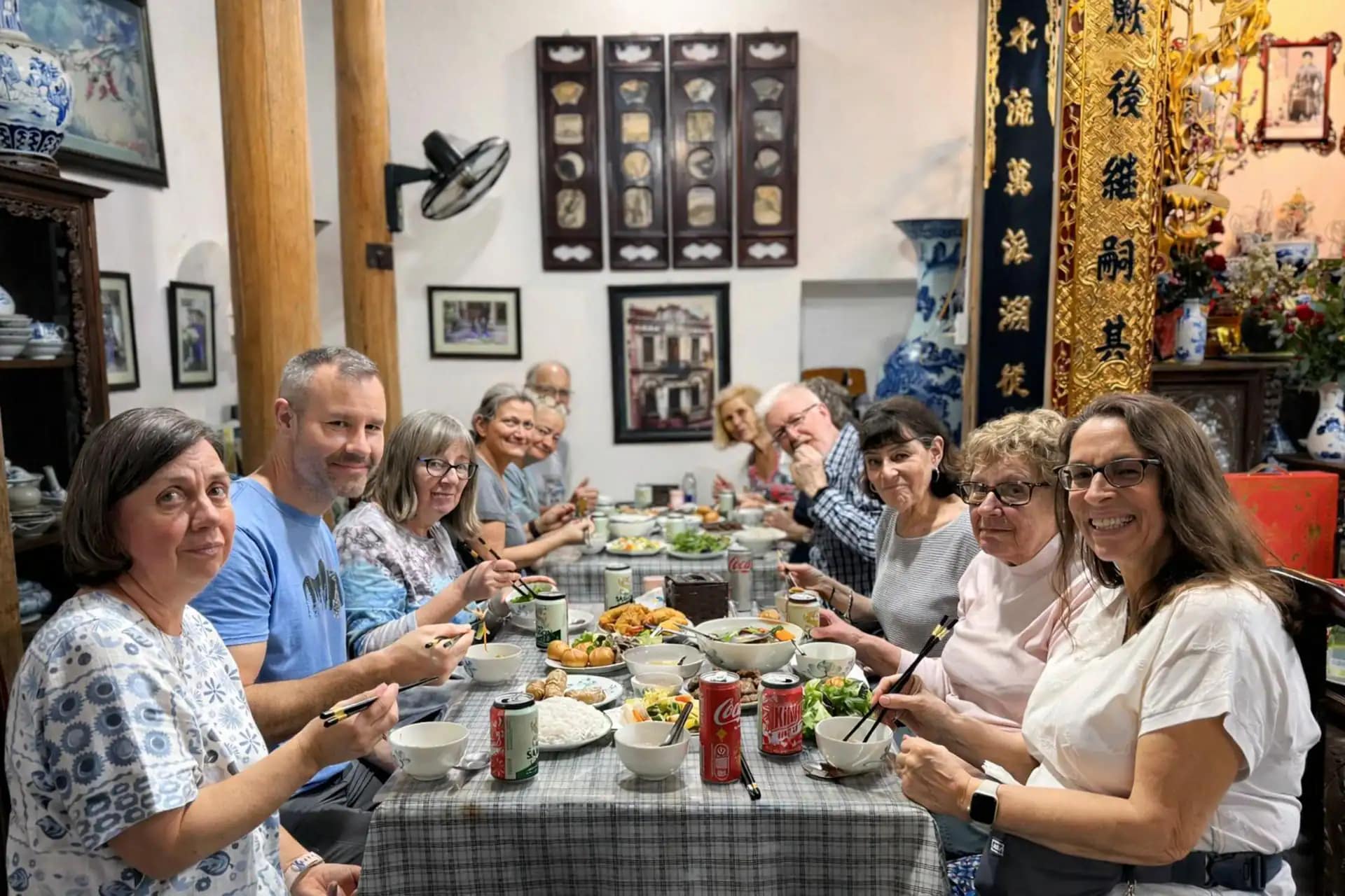 From there we had a 35 minute drive to the 700 year old Bat Trang pottery village to have lunch with a local family. En route we passe lychee and guava plantations and a flower village on the other side of the river – a very fertile area for growing crops. The Red River is the second largest river in Vietnam. In 2019 the pottery village was designated as a national intangible cultural heritage attraction.