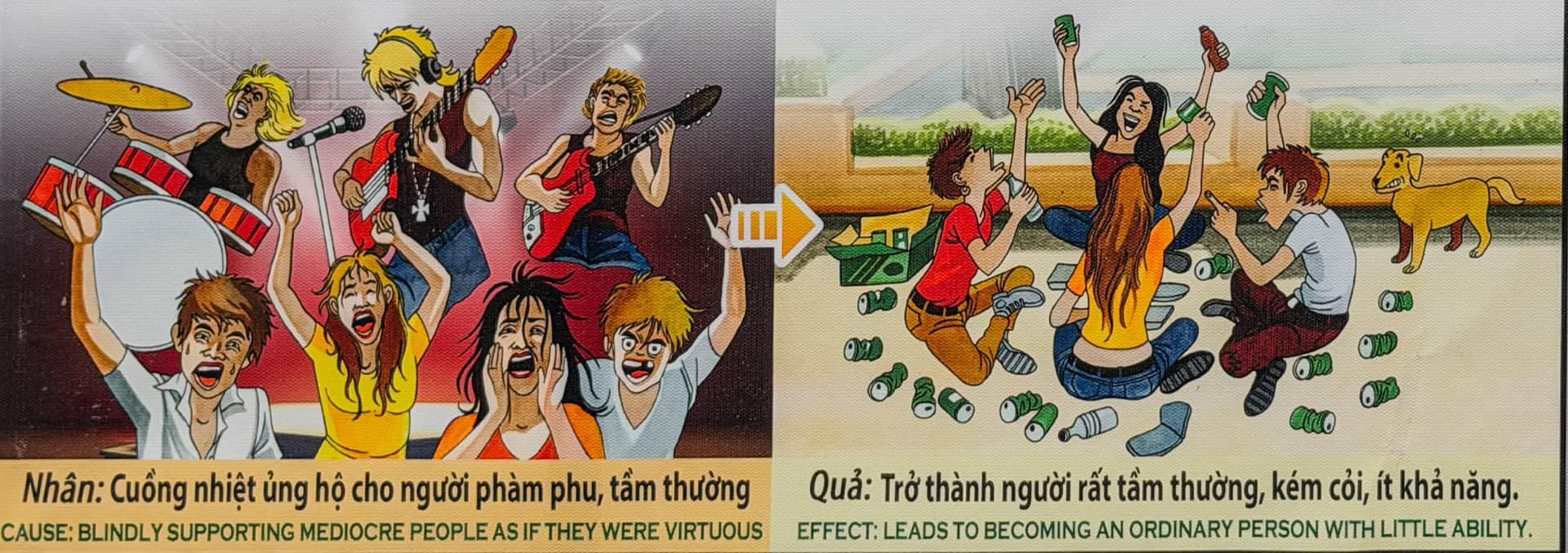 The area around the pagoda was very picturesque, with Japanese style hanging lanterns (long ones whereas Chinese lanterns are round and Hanoian lanterns often shaped like a teardrop or hexagon). There was also an interesting wall display giving details of the laws of karma.