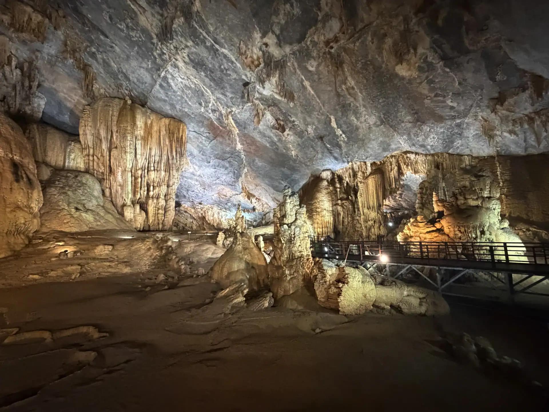 We arrived at Phong Nha, a UNESCO world heritage site known for its beautiful cave complex. We journeyed down the river in two large boats. The contrast to yesterday morning’s boat trip was really noticeable, with a lot of hustle and bustle, tourist outlets and engine noise in contrast to the tranquillity of yesterday’s boat ride. The scenery was spectacular and when we entered the caves, we saw more stunning rock formations before stopping off inside the caves and walking back through them along some boardwalks.